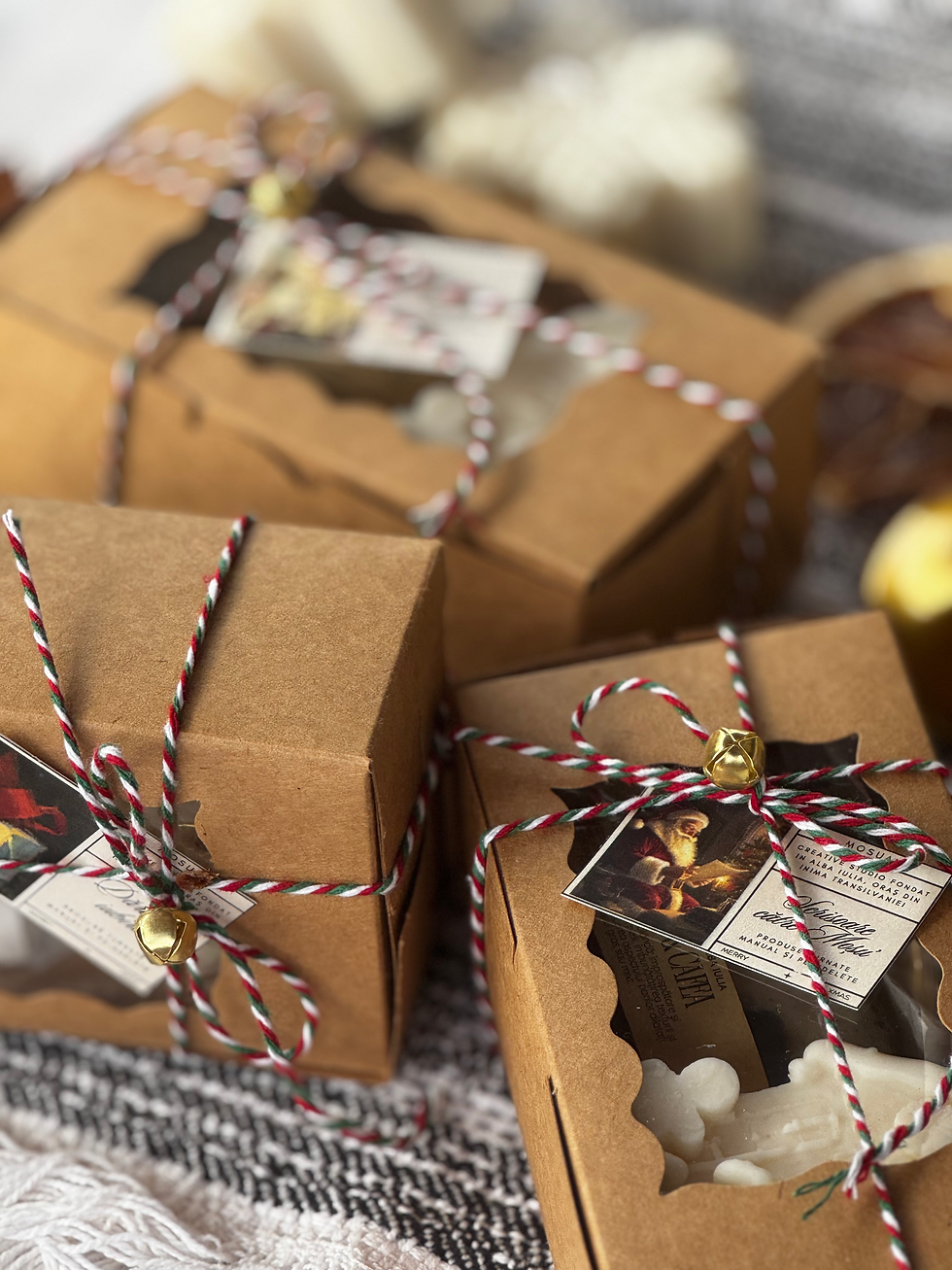 Fiecare produs (chit că nu face parte din colecția de Crăciun) va veni ambalat individual și decorat cu clopoței, crenguțe de brad, șnur sau panglici Crăciunistice, felii de portocală și etichete cu versuri de colinde.